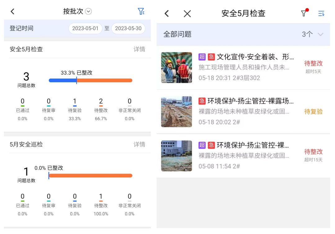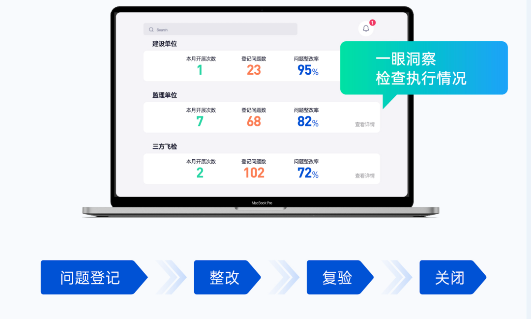检查发现问题的整改进度,会推送到检查负责人,建设单位直观准确区分问题的整改进度,及时追踪督查施工单位、监理单位的的整改落实情况。预约产品演示和交流→打造企业安全管理数字化解决方案