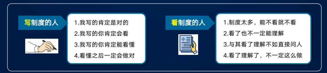 往往编写制度的人,会认为制度都是对的,但是实际落地执行的人会觉得,这个制度太多,能不看就不看了。所以行业中才会有这样的声音:为什么一流的管理制度,不能够形成一流的管理结果,就是因为编写制度的人与一线落实制度的人会有管理认知和专业水平上的一个差异。