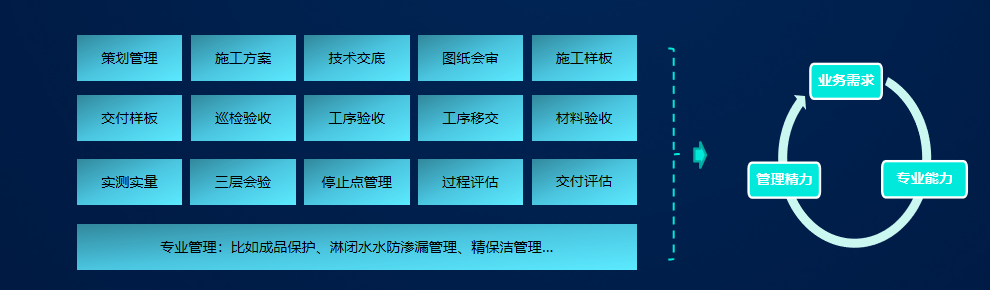 举个例子:某市属国企想搭建一个品控体系,这绝不是做好一个验收就能把质量管好,还涉及到策划、方案、交底、样板多维度的角度,但一线没有精力和能力可以把每件事都做好。