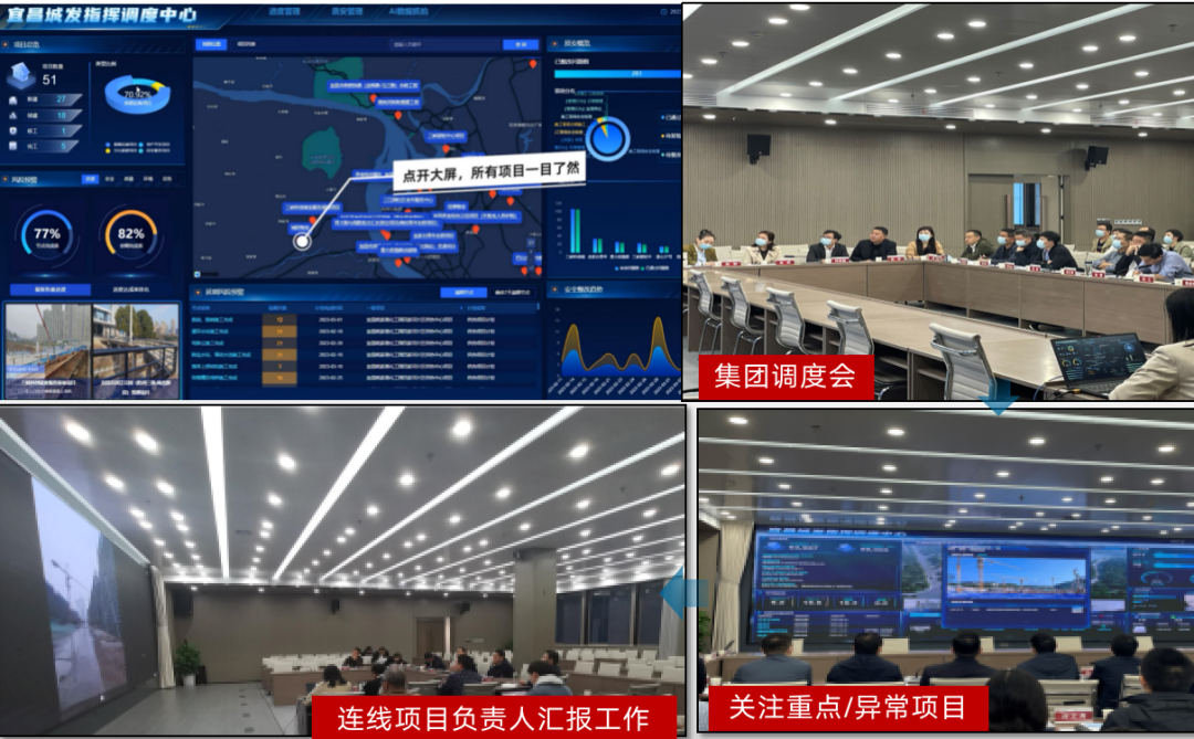 通过明源云搭建了统一的指挥调度中心,在调度会上,通过指挥中心看重点项目或者是出现了异常的项目,进入项目级大屏,就可以看到具体明细的信息,还可以直接通过远程连线的方式,直接听取现场负责人的汇报,并直接进行指导。进入集团大屏,可以对全市所有项目的在建情况,投资情况,进度风险,质量安全管理情况一屏概览。(申请同款产品的演示交流,一键连现场,项目调度指挥更高效)