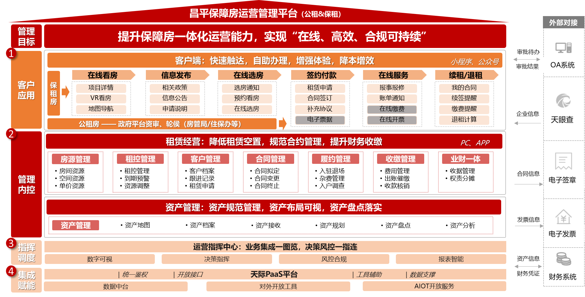 昌平保障房运营管理平台覆盖未来2-3年的公租&保租全场景,成功迈出“十四五”数字化战略规划的第一步。业务、流程在线化,业务流转清晰高效,权责划分清晰,解决了重难点业务系统协同难的问题;数据统计口径统一、及时准确,有力地提升了昌平保障房运营管理一体化能力。