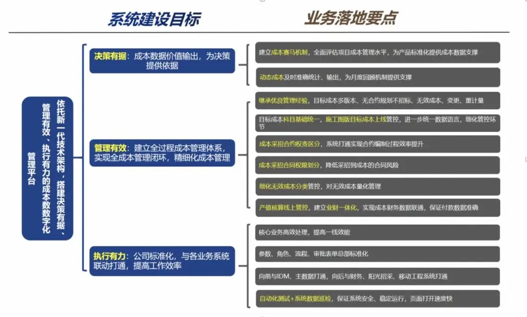 构建精益建造平台,由经验决策迈向数据决策。构建成本精益建造平台,采集全国成本数据,并横向拉通对标。赛出成本标杆项目,找到优秀的成本管理手法,激励优秀的成本人员。成本决策由经验决策转向数据决策,总部发挥服务中心的功能,直接助力一线战场;