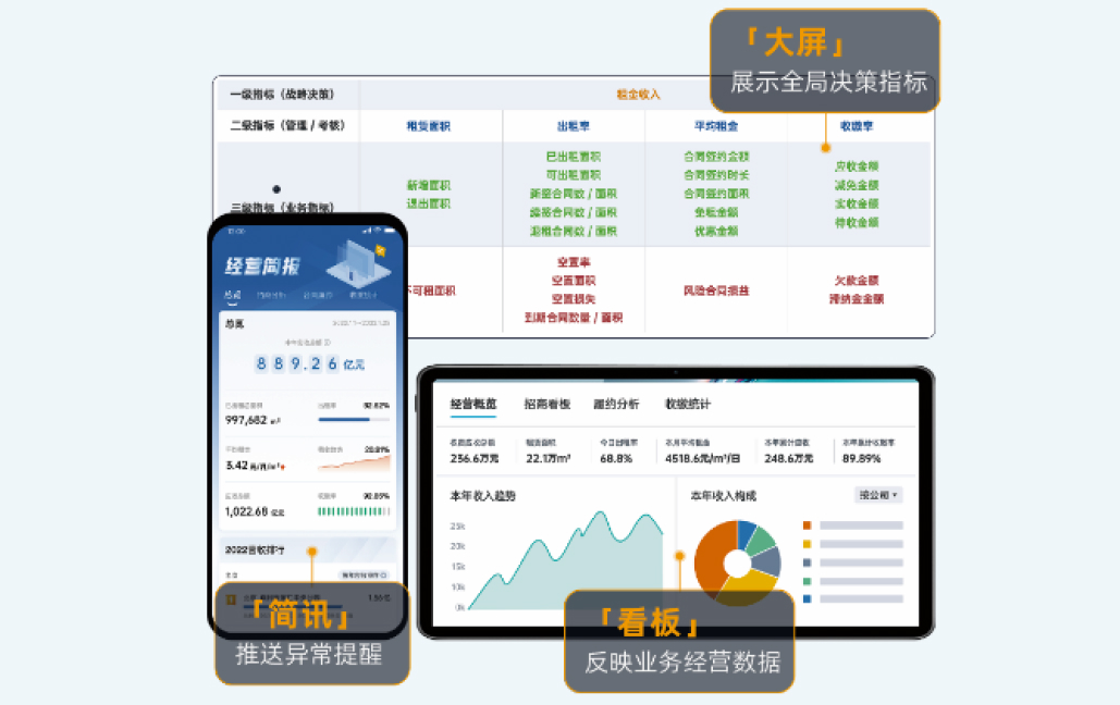 明源云租赁系统,针对存量产业、商业、住宅等不动产租赁业务,以经营增值为核心目标,贯穿招商、交易、财务三大核心业务领域,助力企业打造”标准化、自动化、智能化”的高效运营体系。借助“数字化”手段,助力企业实现精益管理降本提效,盘活闲置资产,促进经营效益稳健提升。