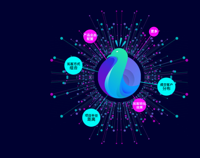 明源云客独创大数据孔雀算法,整合竞品拦截、商圈摆展、商铺扫街、大客户等主要拓客方式,根据项目业态适配、项目距离半径、成交客户分布、拓客转化效果智能匹配最适合项目的拓客方式。